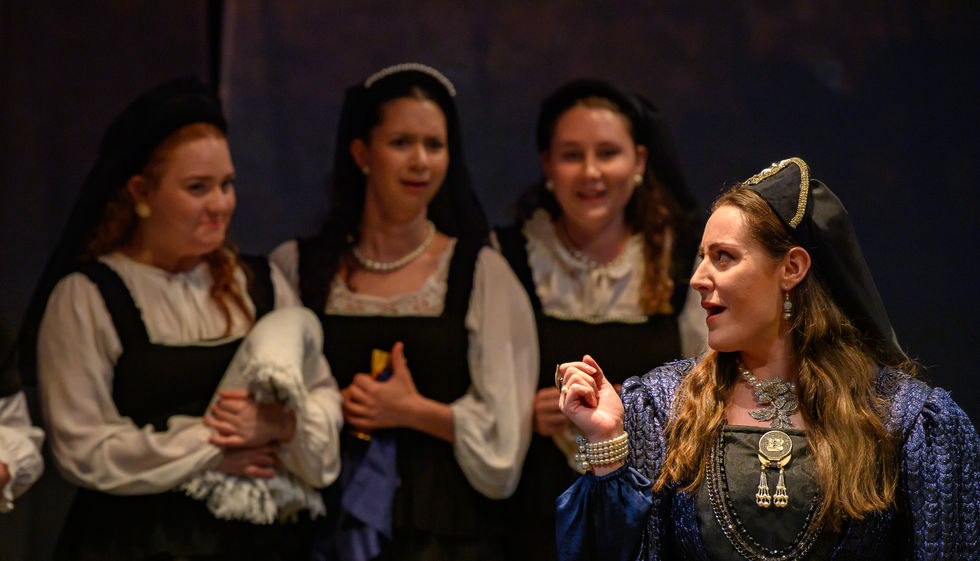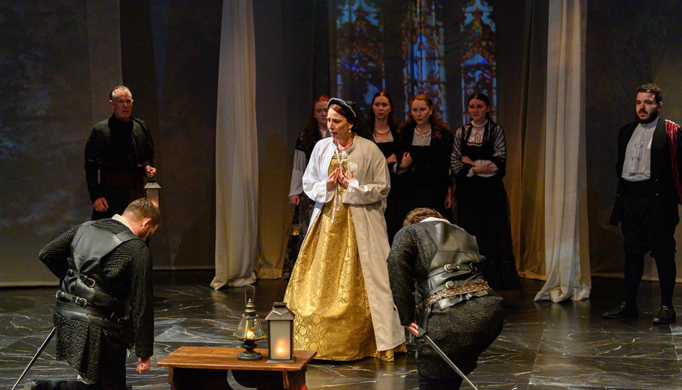 "On one level, this play works as a depiction of historical fact, but Brabon’s intuitive writing and direction has delved much deeper to pose questions about Mary’s character, feelings and motivations. The historical aspects of the play are not depicted in a straightforward linear manner. Instead, Brabon uses various theatrical devices, the most effective being using younger versions of Mary (an impressive Emma Smith) in scenes that give us an understanding of situation, particularly her relationship with her capricious father, Henry VIII (played with commanding strength by Brendan O’Connor). "